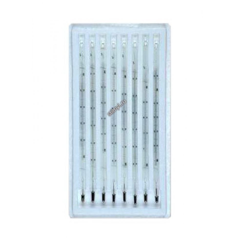 Термометры ТЛ-6 лабораторные. Комплект из восьми ртутных термометров предназначенных для измерения температуры в пределах –30 +350 °С в малогабаритных сосудах при лабораторных работах. Термометры лабораторные.Комплект из восьми ртутных термометров предназначенных для измерения температуры в пределах –30 +350 °С в малогабаритных сосудах при лабораторных работах.Изготавливаются по ТУ 25-2021.003-88.Имеют «Сертификат об утверждении типа средств измерений».КонструкцияСтеклянные термометры с вложенной шкальной пластиной.
